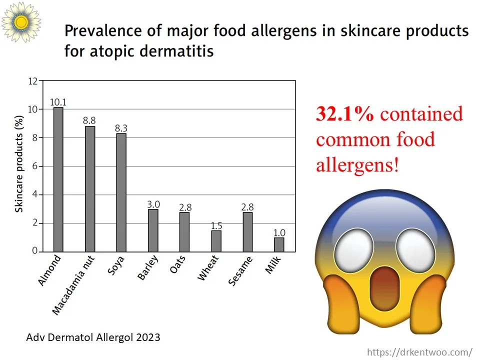 A landmark study analyzed 154 eczema‑care products and found that 32.1% contained ingredients derived from common food allergens – mostly in the form of oils or extracts. PMC