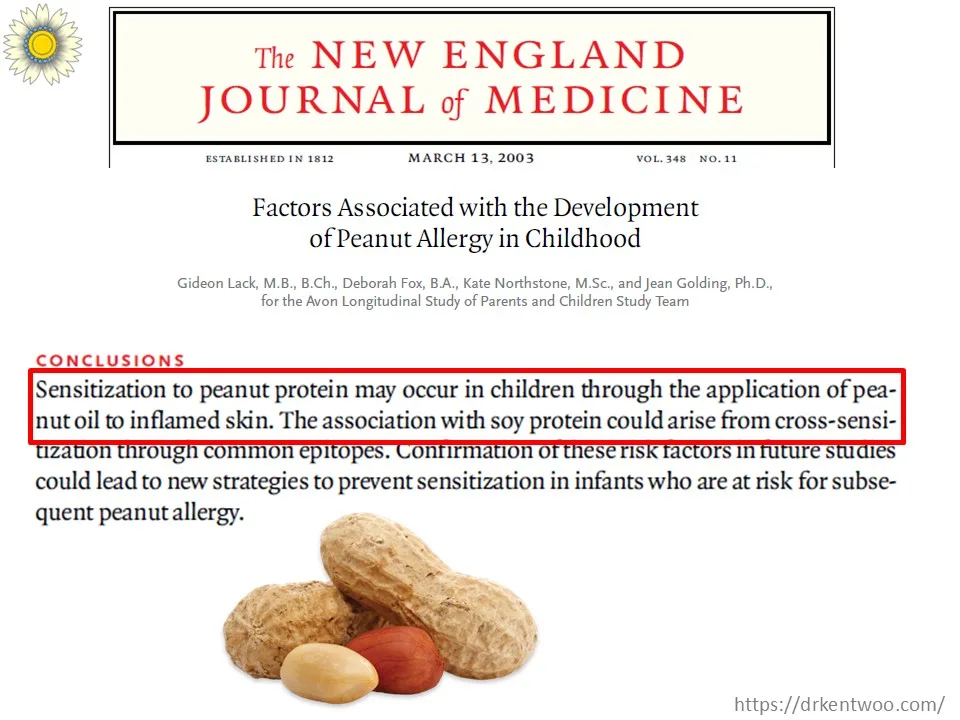 In the ALSPAC birth cohort, researchers linked peanut oil application in creams to later peanut allergy. Children with inflamed skin who used peanut‑containing products were more likely to develop peanut sensitization. PubMed
