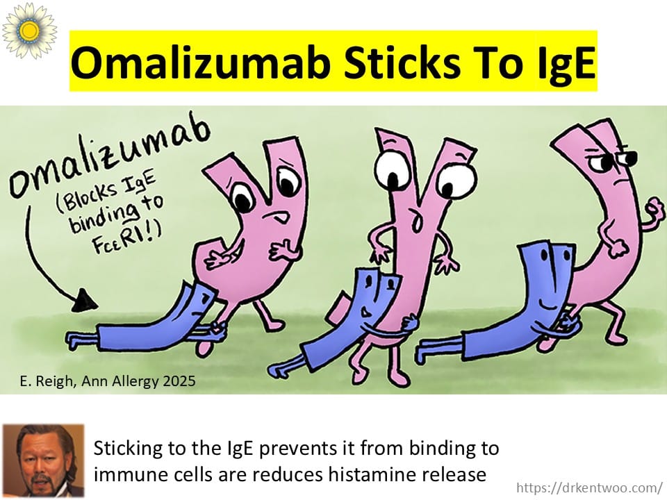 • Xolair attaches to circulating IgE, preventing it from binding to high-affinity receptors (FcεRI) on mast cells and basophils.